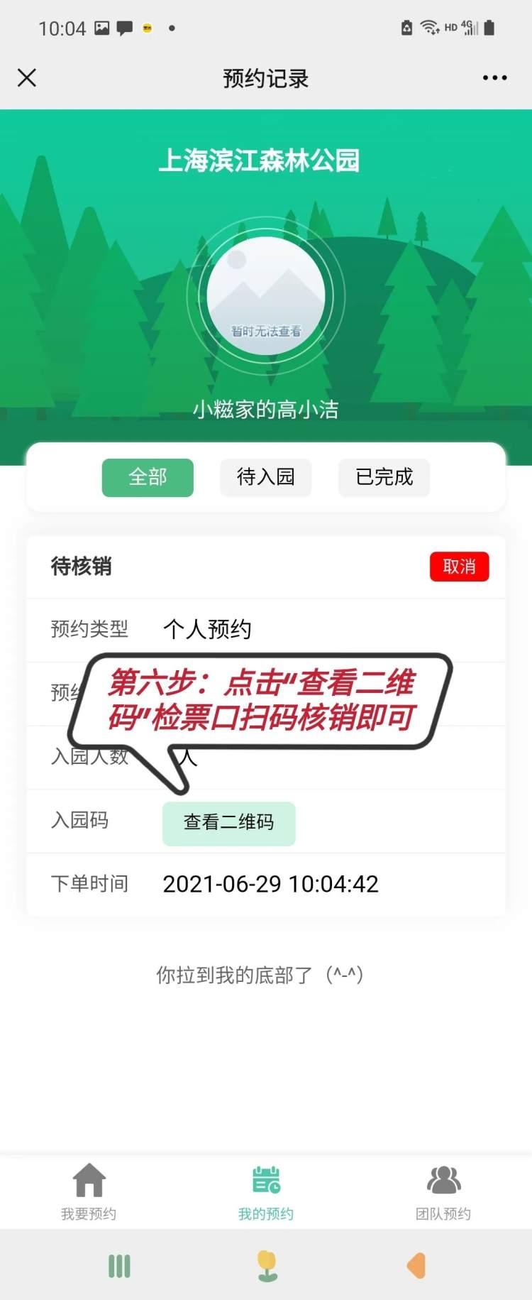 4.入园前在公众号菜单栏“免费预约”→“我的预约”中调出二维码核销