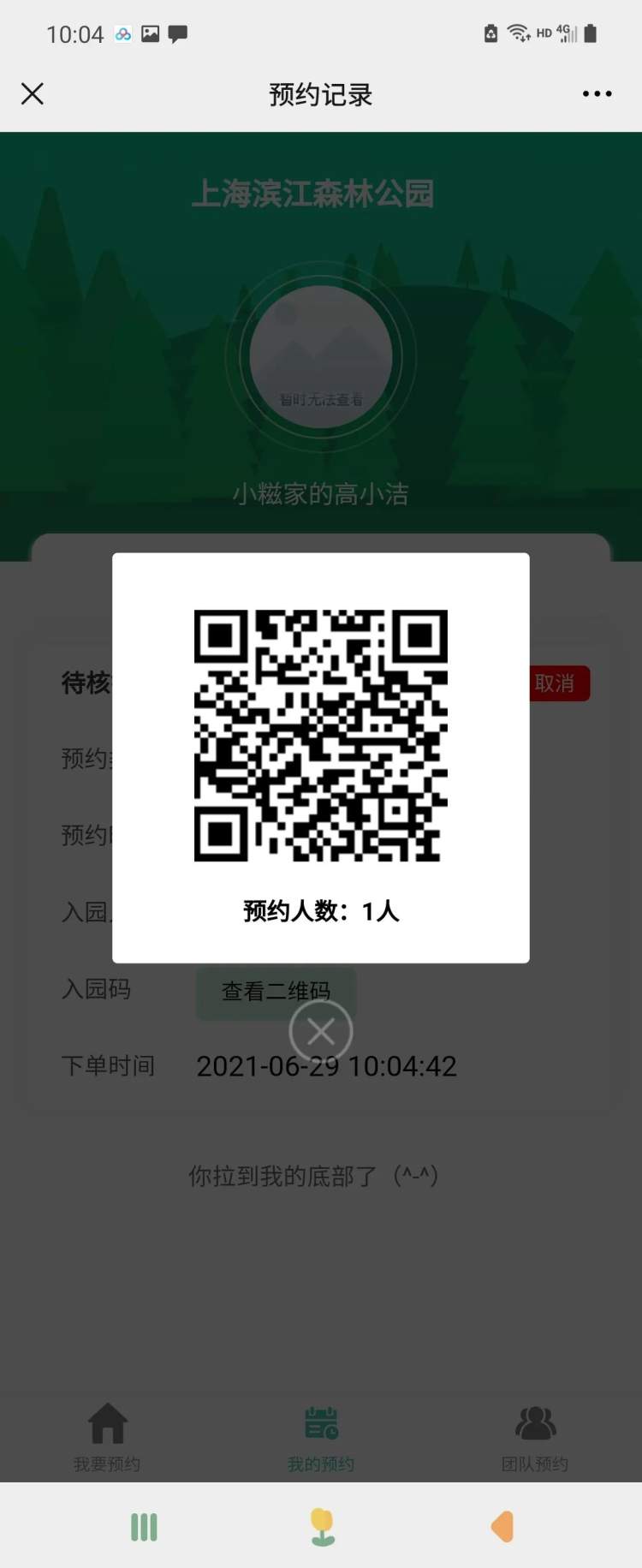 5.在“我的预约”中点击“查看二维码”即可调出二维码,在检票口进行扫码核销入园。
