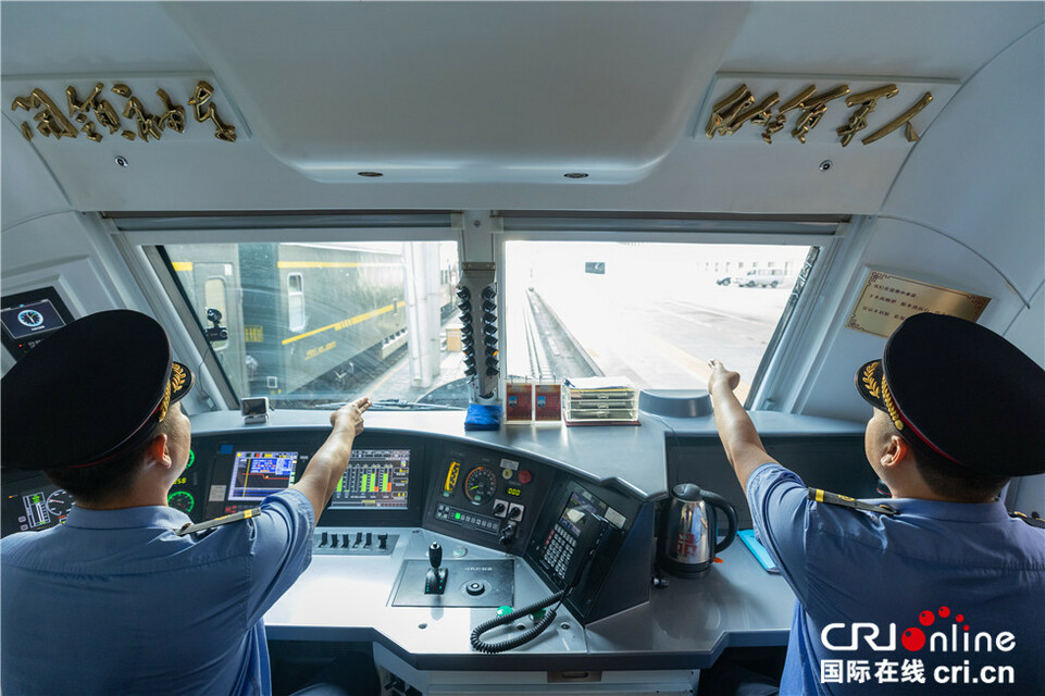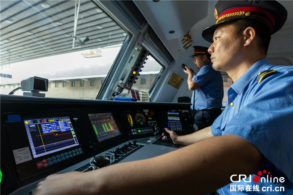 “毛泽东号”机车司机崔艳超正在驾驶机车。崔艳超说:“自从来到‘毛泽东号’后,我时刻以高标准要求自己,作为机车组的一员,要传承好‘毛泽东号’精神,做一名合格的‘毛泽东号’机车组人。”摄影:沈湜