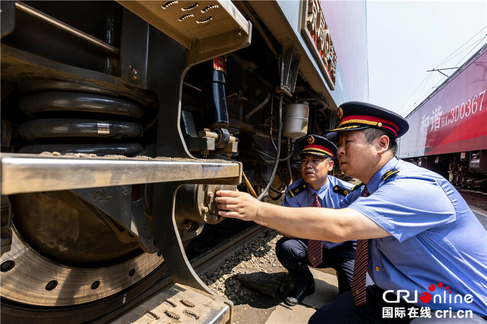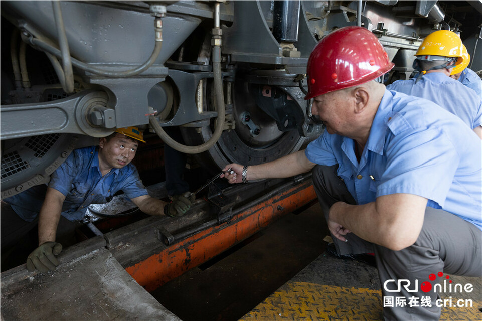 6月10日,正值“毛泽东号”机车回库检修换轮对作业,吴伟(左)和同事正在将新的轮对吊装到指定位置。摄影:沈湜