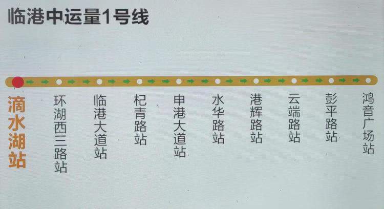 中运量1号线总长21.7公里,共设10个站点,分别为鸿音广场站、彭平路站、云端路站、港辉路站、水华路站、申港大道站、杞青路站、临港大道站、环湖西三路站、滴水湖站。其中,滴水湖站和临港大道站可与地铁16线换乘。