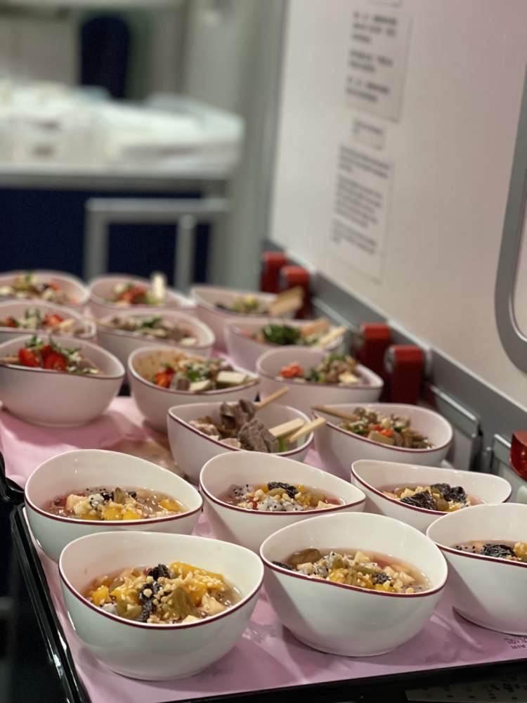 此外,首架天府出港HO1120航班还安排包括冷锅串串、冰粉、红糖糍粑等川渝地区特色餐食,当日其余出港航班公务舱提供带有吉祥祥云图案的绿豆糕点心。