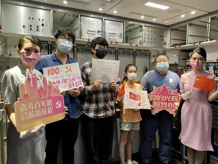 乘务组特别佩戴了云纹元素的吉祥定制口罩,并安排了空中“党史进客舱”红色主题航班活动,机舱内随处可见鲜艳的五星红旗。