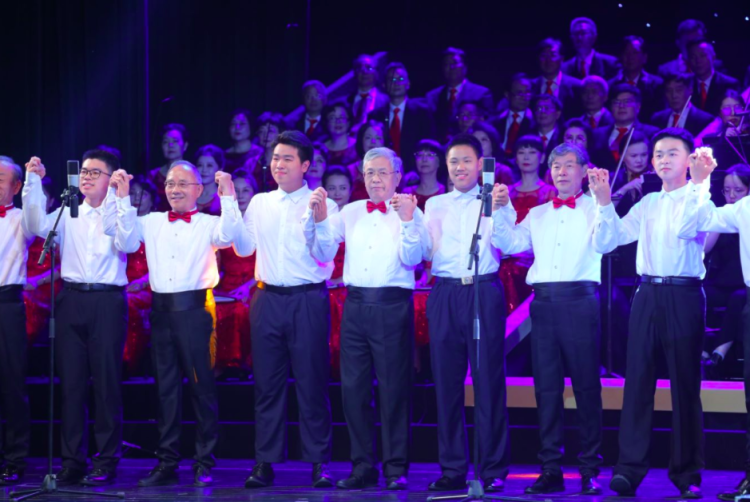 之后,同济大学老年艺术团合唱团“70后”的老人们与洋泾中学男声合唱团跨时代同台合唱《年轻的朋友来相会》、《二十年后再相会》,“美妙的春光属于谁?属于我属于你,属于我们八十年代的新一辈”,唱出了两代人追逐中国梦的澎湃激情和建设祖国的主人翁精神。