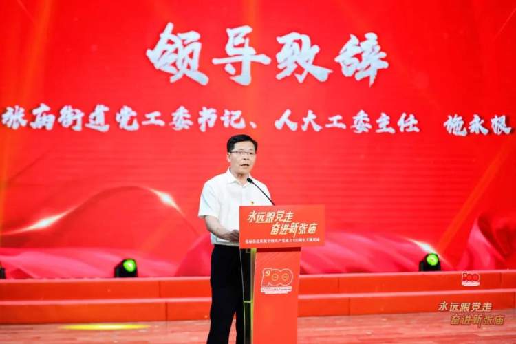 施永根同志在致辞中表示,一百年来,我们党矢志践行初心使命,团结带领人民开辟了伟大道路、建立了伟大功业、铸就了伟大精神,在中华民族发展史和人类社会进步史上写下了壮丽篇章。他指出,近年来,张庙街道主动融入“科创中心主阵地”建设,在党的建设、经济发展、城市治理、民生保障等方面展现了张庙风采,擦亮了张庙品牌。各项工作成效显著,区域凝聚力、吸引力、创造力、竞争力、影响力不断增强,广大群众的幸福感、获得感和安全感显著增强。他指出,要继续发扬疫苗接种攻坚战中展现出的张庙品牌、张庙精神、张庙风采,在区委区政府的坚强领导下,团结带领街道广大党员干部,传承红色基因,担当实干,逐梦前行,想群众之所想、急群众之所急、解群众之所难,不断提升街道的硬实力和软实力互动并进、相得益彰,努力建设“科创宝山、品质张庙”的新时代人民社区,再造一个新张庙,再创一个新传奇。