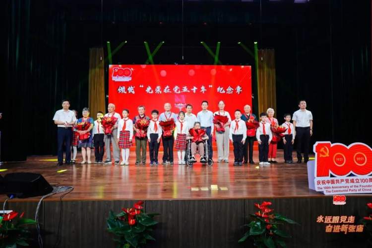 表彰仪式上,王益群同志、施永根同志和黄一欣同志共同为老党员代表颁发“光荣在党50年”纪念章,少先队员们向他们送上了鲜花。