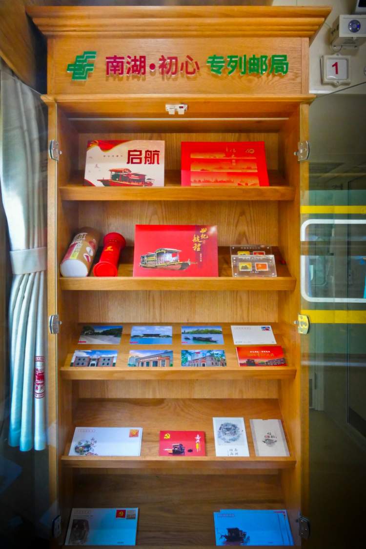 上海至嘉兴红色教育主题列车采用10节编组,车底通过普速列车改造而成,全车外部采用红、金、绿配色,既保留古朴的绿皮火车风格,又体现了红色文化元素。两节车厢改造成红色教育主题功能车厢,设置了“火车邮局区”“火车学习角”、上海党的一大会址及嘉兴南湖红船老照片展示区等。