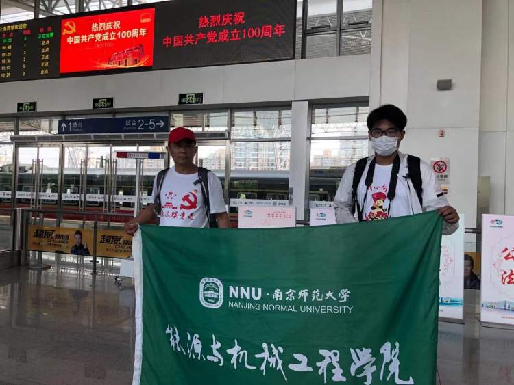 南京师范大学能源与机械工程学院教师邵英澍是其中一员。他身穿印着“永远跟党走”字样的白色T恤,胸前佩戴着党徽,还拿着专业相机。“我是昨天从南京特地来上海的,今天一早5点多先去了一大会址,然后再来西站坐火车。”邵英澍说,他是代表学院来“重走一大路”的,因为今天的这趟车票特别难买,还让儿子帮忙抢票。一旁,邵英澍的儿子同样身穿印有“永远跟党走”字样的白色T恤。