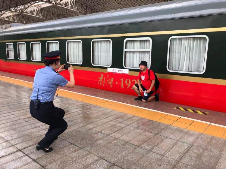 在上海南湖职业技术学院读书的朱学成是嘉兴人,“昨天学校最后一天上课,今天正好乘红色主题列车回家,顺便也体验一下。”小朱边说边举着专业相机拍照。