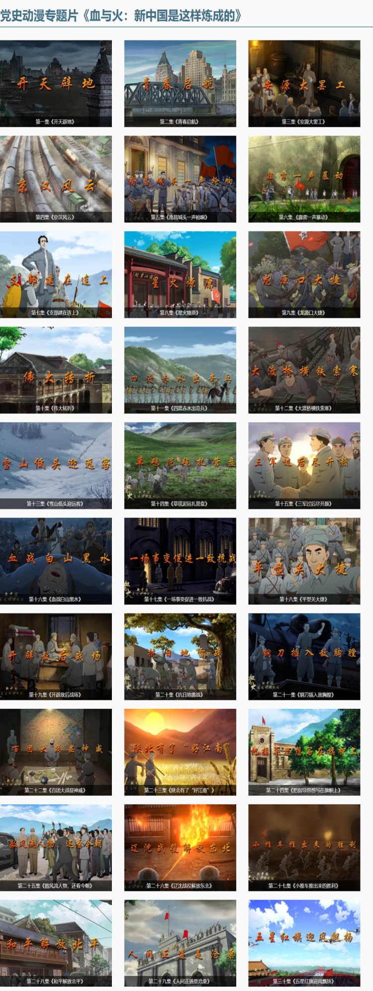 该片聚焦从中国共产党成立到新中国成立28年的革命奋斗史,首次以动漫方式展现,共30集,每集3分钟左右,通过清新简洁、精美流畅的画面再现历史细节,生动讲述《开天辟地》《南昌城头一声枪响》《星火燎原》《四渡赤水出奇兵》等党史故事。