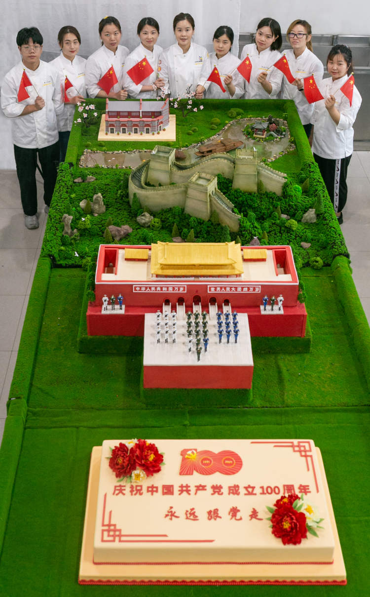我个人的成长经历和党的关怀是息息相关的。当年带我入行的恩师史见孟(我国烘焙培训教育界奠基人)先生就是一位有着30年党龄的老党员,作为一名烘焙从业人员,我们能用自己的手艺,就是想着做一个有代表性的蛋糕。感谢这个时代,作为一个烘焙人,这可能是我今生做过的最有意义的一个蛋糕!