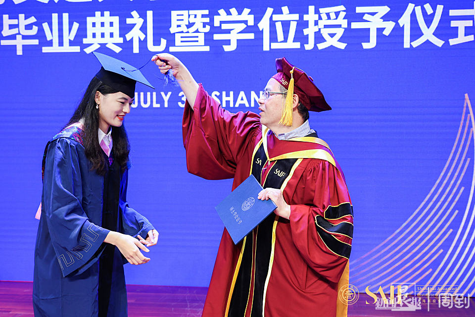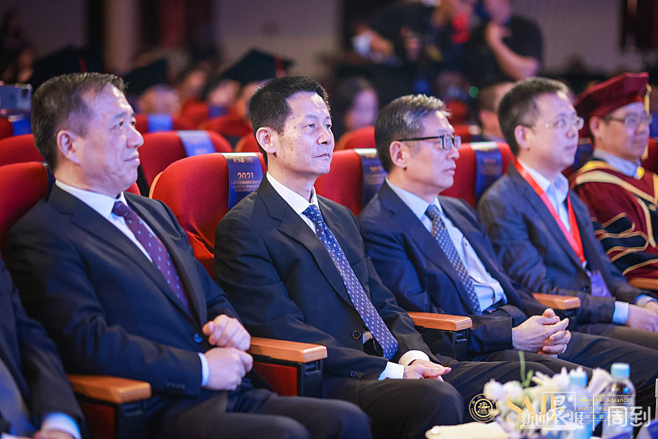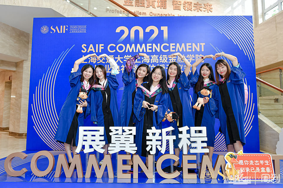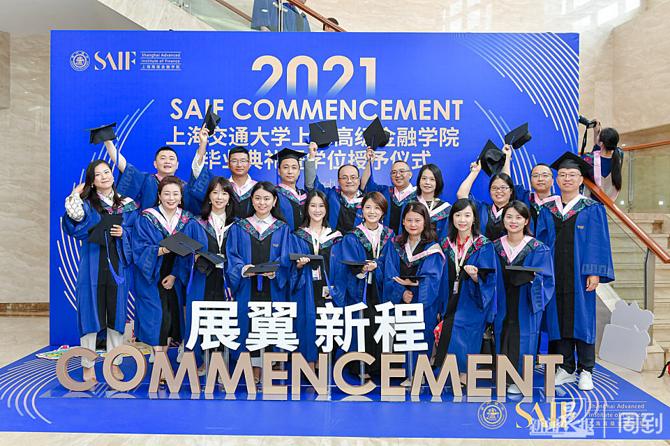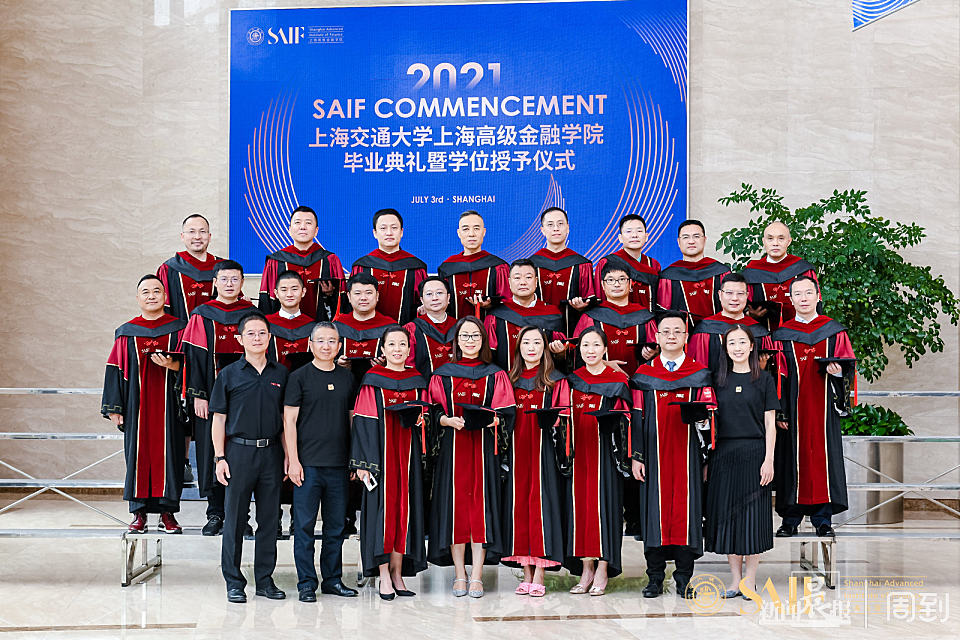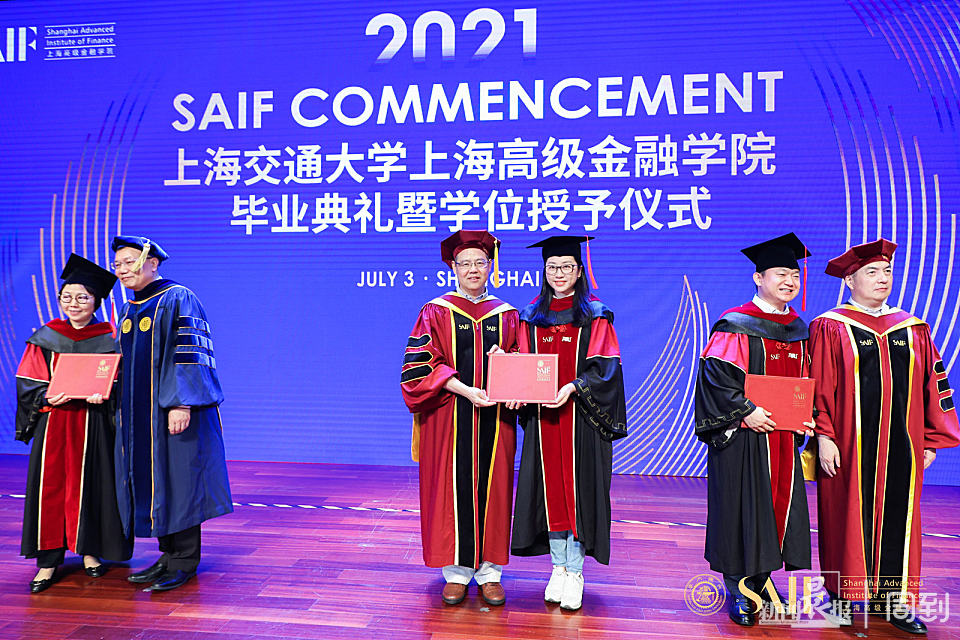 7月3日,上海交通大学上海高级金融学院(高金/SAIF)2021年毕业典礼上,上海市委常委、副市长、高金理事长吴清和上海交通大学党委书记、高金副理事长杨振斌祝贺毕业学员们鹏程万里,在工作岗位上坚守诚信。