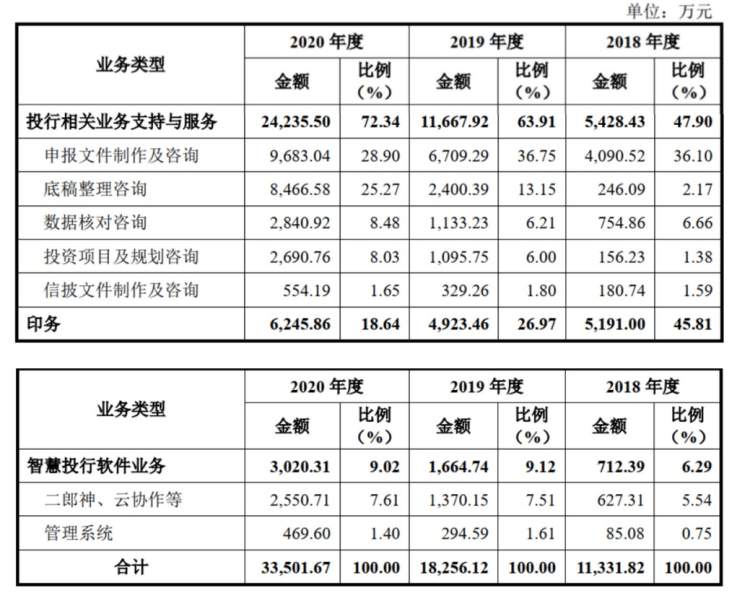 2018-2020年,公司主营业务来自投行相关业务支持与服务、印务和智慧投行软件业务三大板块,前两者占比9成以上,其中投行相关业务支持与服务占比逐年增加,印务收入占比逐年下降,从2018年的45.81%降至2020年的18.64%,可见其不是一家传统打印店。