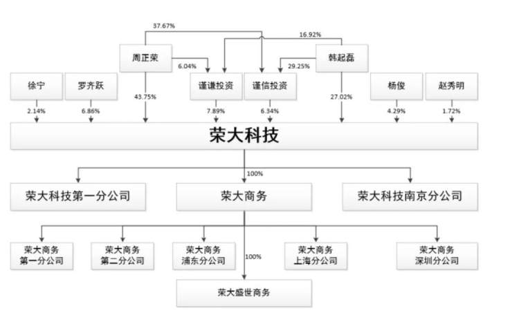 荣大科技成立于2014年8月,注册资本为4200万元,并全资持有北京荣大商务有限公司(荣大商务,注册地址为北京市金灿酒店三层),荣大商务则管辖着北京总部、上海荣大、深圳荣大几处业务地。此外,荣大科技还设有一家南京分公司。