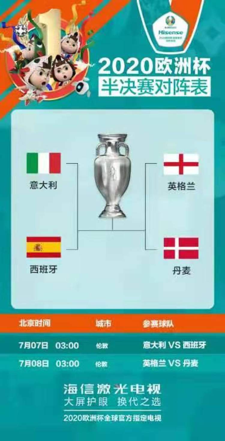 其中,意大利与西班牙会师半决赛,英格兰将与丹麦争夺另一张决赛门票。