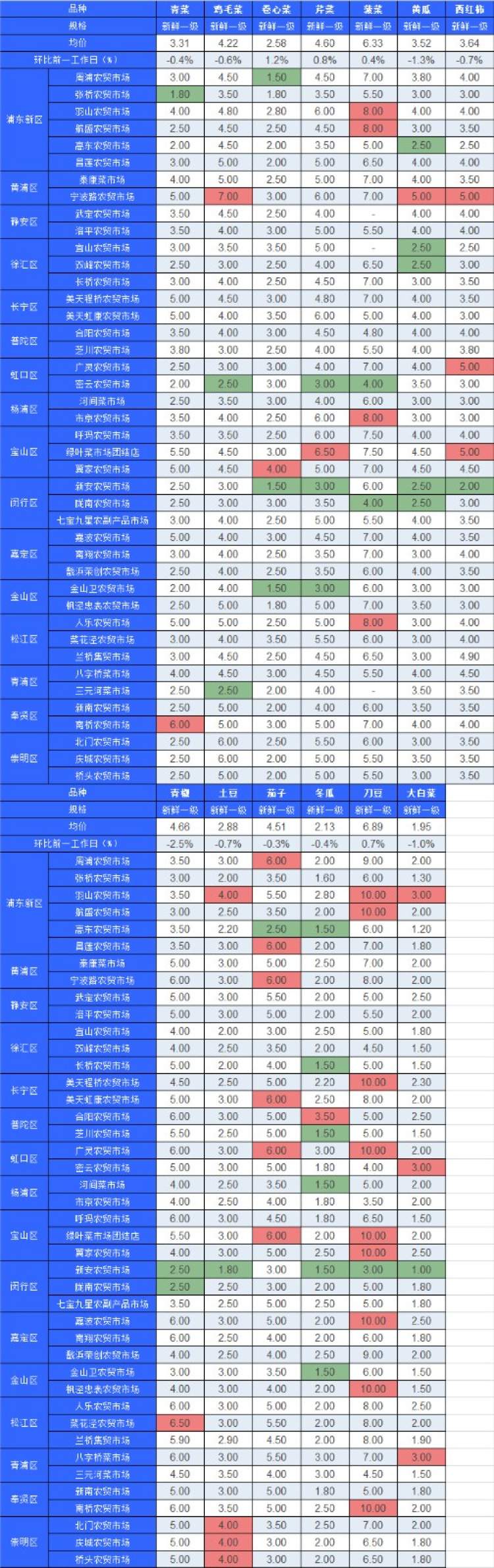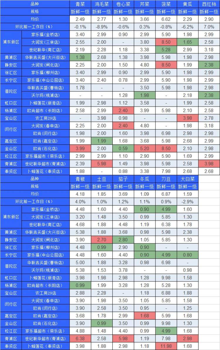■粉底标注代表该蔬菜品种在上述农贸市场或超市的最高价;绿底标注代表该蔬菜品种在上述农贸市场或超市的最低价