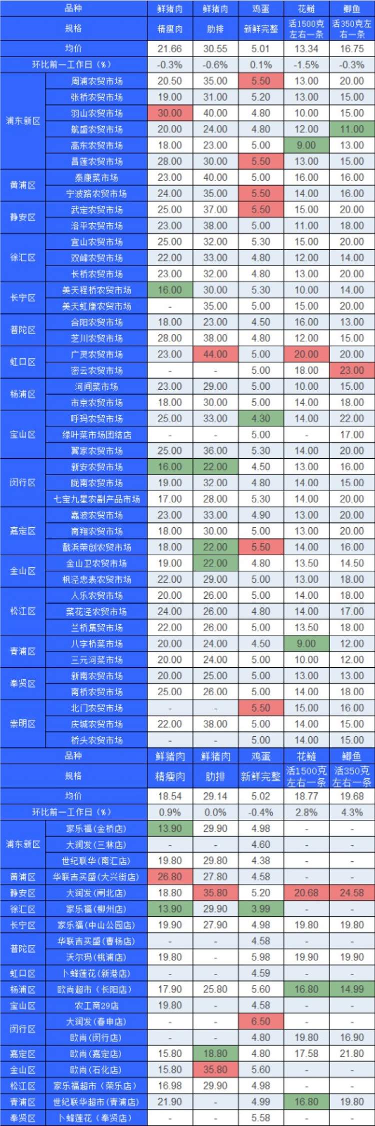 ■粉底标注代表该肉蛋鱼品种在上述农贸市场或超市的最高价;绿底标注代表该肉蛋鱼品种在上述农贸市场或超市的最低价