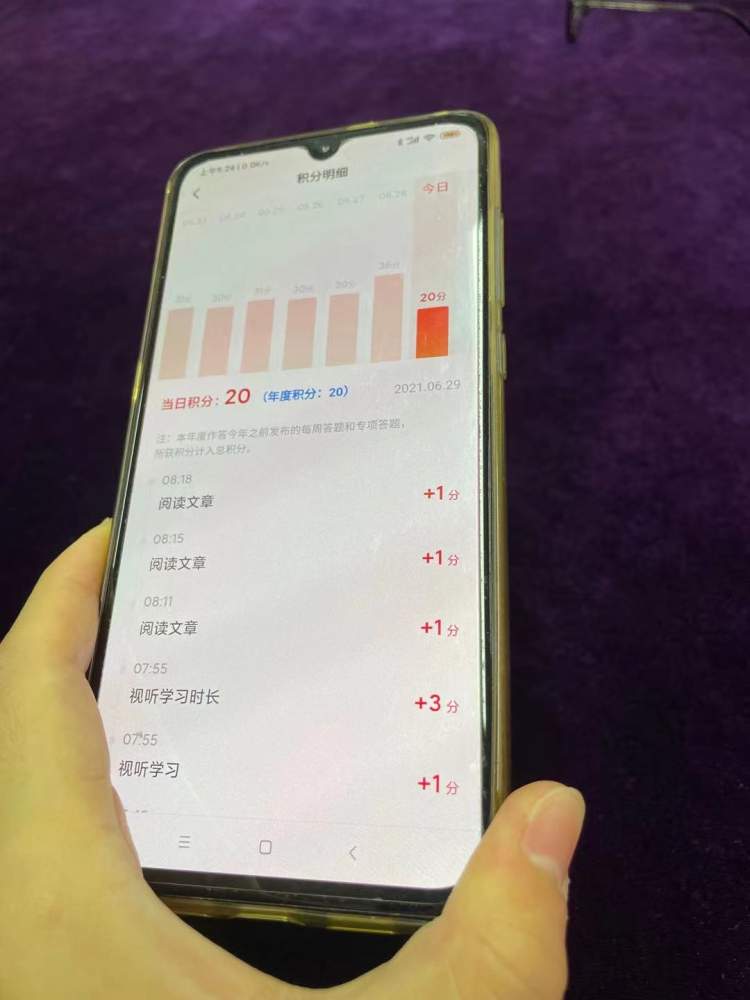 面对困难,史素大没有放弃,虽然目力远不及年轻人,但他仍找寻身边的一切资源解决难题。象山居民区党总支书记韩骏为他下载好APP,社区里只要有来做志愿者的学生朋友,他便不耻下问地去请教,他还参加了智能手机班,和学生志愿者一起交流、切磋。很快,他开始每天在学习强国上刷分了,分数也越来越高,党支部要求每个党员每天30分,史素大不甘落后,每天都能达到30分以上,他介绍道:“我每天早晨、中午、晚上各看45分钟,就像一日三餐一样,不看还不习惯。”