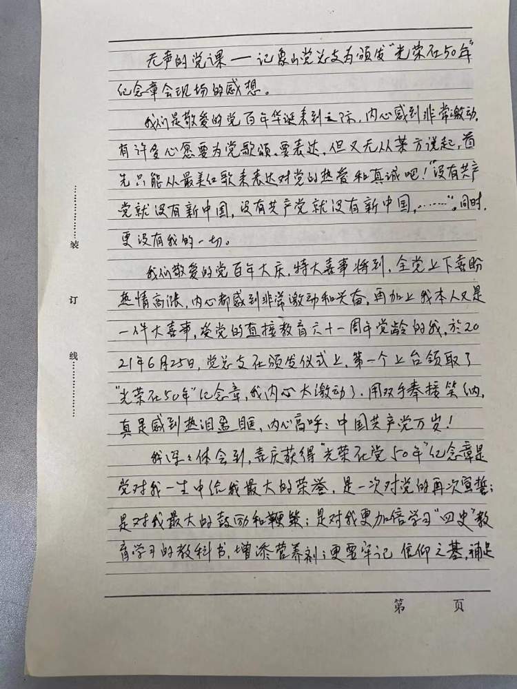 2021年6月底,象山居民区党总支为社区里在党50年以上的老党员颁发了纪念章,史素大第一个上台领取了纪念章,此情此景让他感慨万千,激动万分。第二天,他便写了一份心得体会,交给了党总支。文中,他动情地写道:“我深深体会到,‘光荣在党50年’纪念章是党给我的最大荣誉,是我对党的再次宣誓……我一定会认认真真学好、用好组织上所发的一系列珍贵学习资料,做到重点学、常态学,学有成效,并体现在行动上!”言辞恳切,让人动容,韩骏把这份心得体会给了居委的两位年轻党员传阅,让年轻同志借此机会感受一下老同志“四史”教育的学习成果。