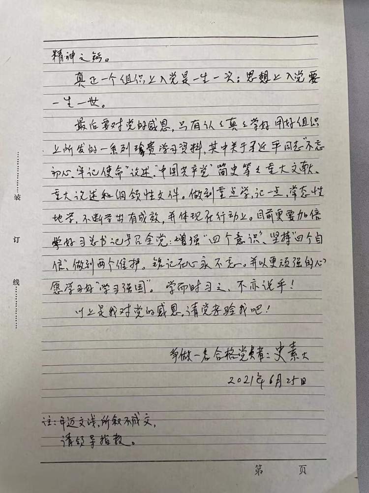 在体会的最后,他写道:“以上是我对党的感恩,请党考验我吧!”韩骏对他说:“这是又写了一份入党申请书啊,你太谦虚了,你的感悟也给我们上了很好的一课。”记者注意到,心得体会的落款是“争做一名合格党员:史素大”。像史素大这样的老党员,在社区还有很多,他们的学习劲头以及党性觉悟始终是年轻党员的好榜样。