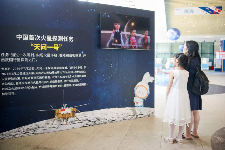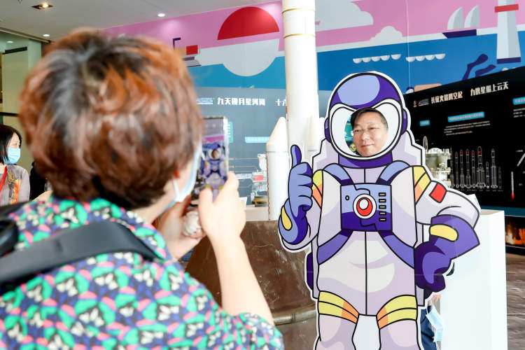 探月展区,既有2米9高的长征五号运载火箭模型,长征2号丁一级发动机尾喷管、启动阀门等多个火箭实物回收残骸,还能看到玉兔二号月球车、祝融号火星车、空间对接站等人气实物模型。观众能现场了解天问一号探秘火星“绕落巡”的航天任务,以及中国现役长征系列运载火箭庞大家族的科研故事。通过展板、图片、视频等形象领略中国探月、探火的进程。
