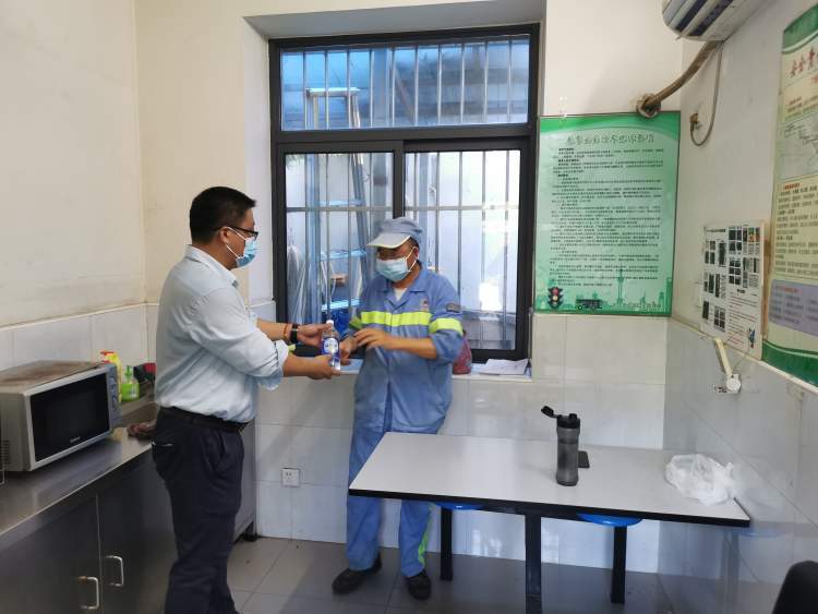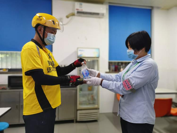 公交工作人员为外卖小哥送上盐汽水