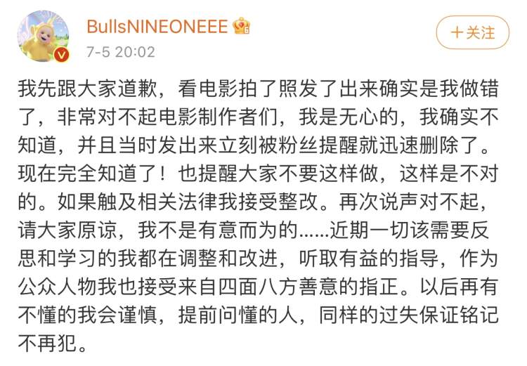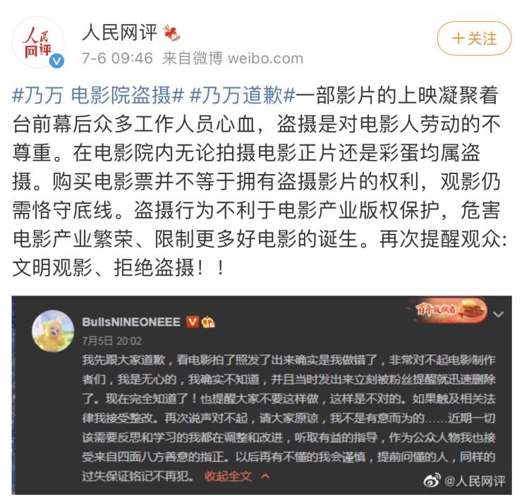 当晚,“乃万电影院盗摄”这一词条引发网友热议,乃万随后发布一条道歉微博,表示“非常对不起电影制作者们,我是无心的,我确实不知道,并且当时发出来立刻被粉丝提醒就迅速删除了。如果触及相关法律我接受整改。”
