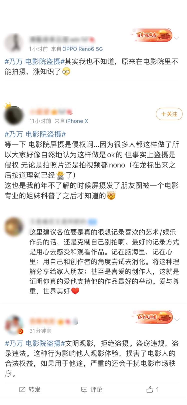 这场“无心之失”引发热议之后,不少网友表示自己此前也没有注意过,还以为屏摄发朋友圈是正常的事,这次乃万事件也是对大家的警醒,电影院屏摄是坚决禁止的。