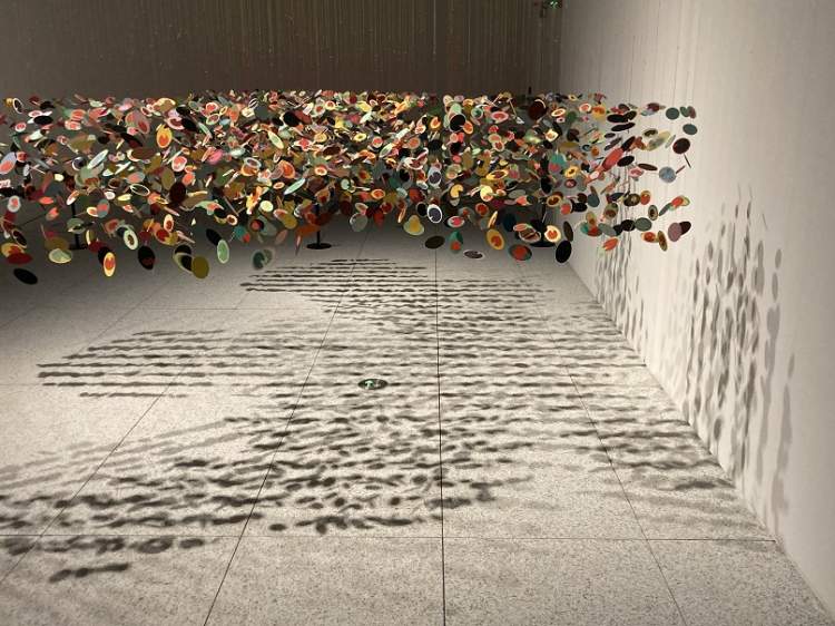 展览中,佩·怀特用纸和线制作而成的装置作品《悬垂断章》,有着令人迷眩的色彩和光影效果,但是数百根从天花板上密密麻麻垂直而下的线和纸,要不让它们缠绕起来,还真有点难度,万一来点风或者哪个观众手贱搅动一下……光想象一下这场景,我都会得焦虑症。