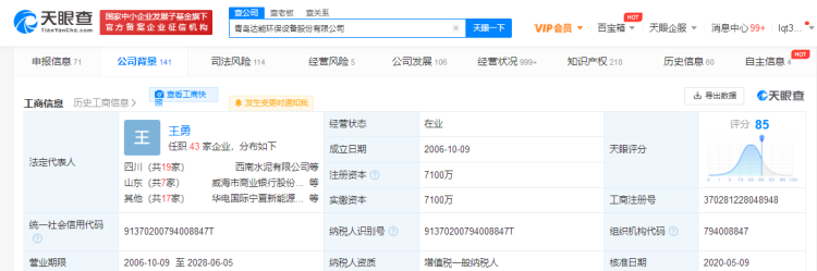 天眼查数据显示,青达环保成立于2006年10月,公司注册资本7100万元人民币,法人代表王勇;青达环保主要从事节能降耗、环保减排设备的设计、制造和销售,为电力、热力、化工、冶金、垃圾处理等领域的客户提供炉渣节能环保处理系统、烟气节能环保处理系统和清洁能源消纳系统解决方案。