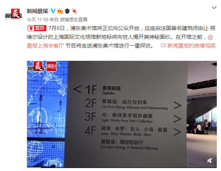 7月8日,被誉为上海国际文化场馆新地标的浦东美术馆将正式向公众开放。今天中午,新闻晨报上海会客厅节目提前走进浦东美术馆进行了全程实况直播(点击见直播节目回放),不少上海市民通过周到上海和新闻晨报新浪微博、新闻晨报021视频号等多个平台收看了直播节目。