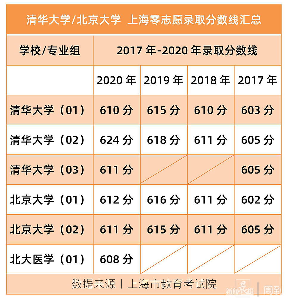 记者查询往年信息了解到,2020年清华大学和北京大学在上海的零志愿共投放53个招生计划,其中清华大学分设3个院校专业组,共计招生计划26个;北京大学分设2个院校专业组,共计招生计划26个,另北京大学医学部设1个院校专业组,招生计划1个。