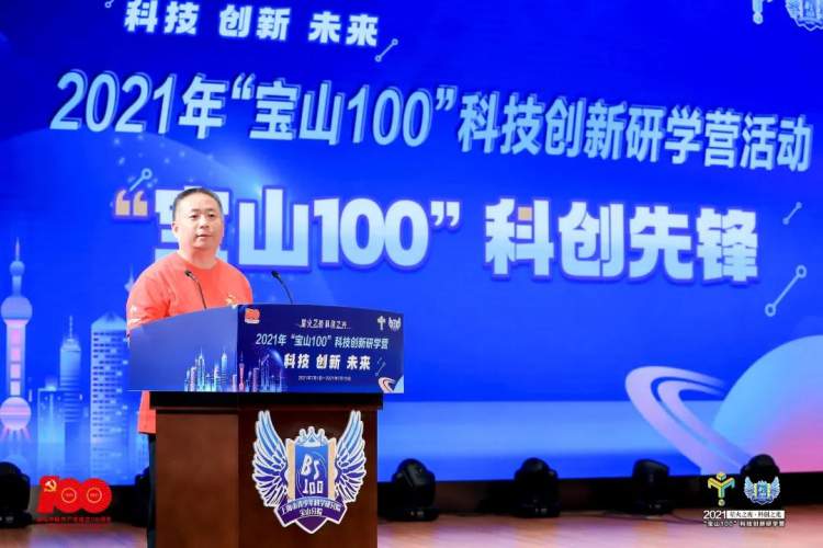▲宝山区青少年活动中心党支部书记刘平宣布2021年“宝山100”科技创新研学营活动开营