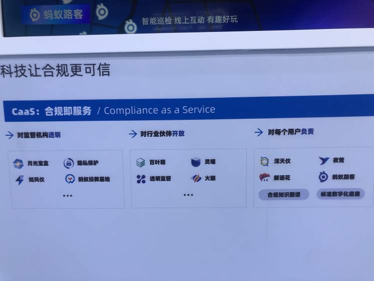 在蚂蚁集团的展区,里面涉及到隐私计算、合规服务等链条,科技让合规更可信,合规即服务的链条环节中,涉及到对监管机构透明、对行业伙伴开放,以及对每个用户负责。