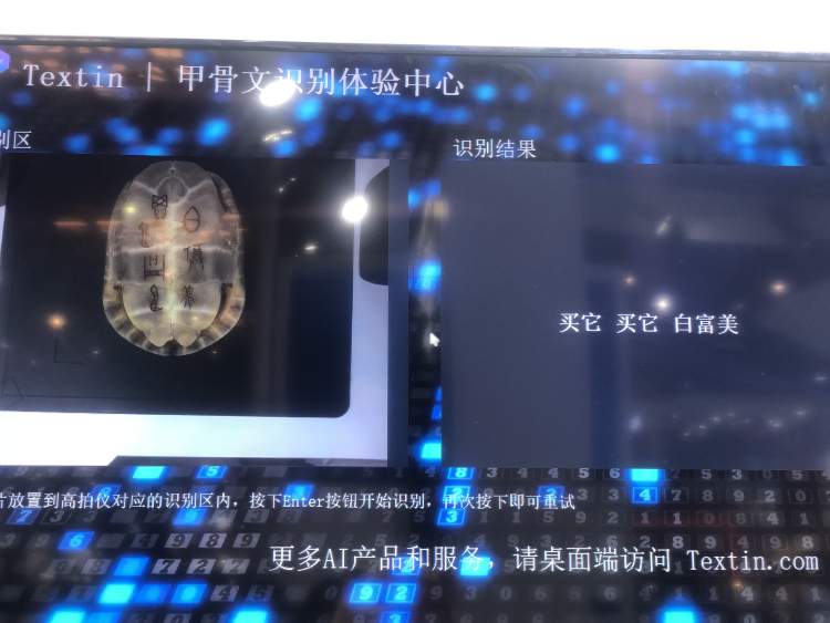 “你看看这个甲骨文,放在我们这个镜头下,就能识别上面的文字。”合合信息的一工作人士一边说,一边向周到君演示,大屏幕上随机跳出:“买它 买它 白富美”等文字,该人士说,这是一项公益实验,通过智能文体识别技术,尝试用AI识别和分析甲骨文字体,为古籍的保护、整理、研究、利用注入科技的力量。