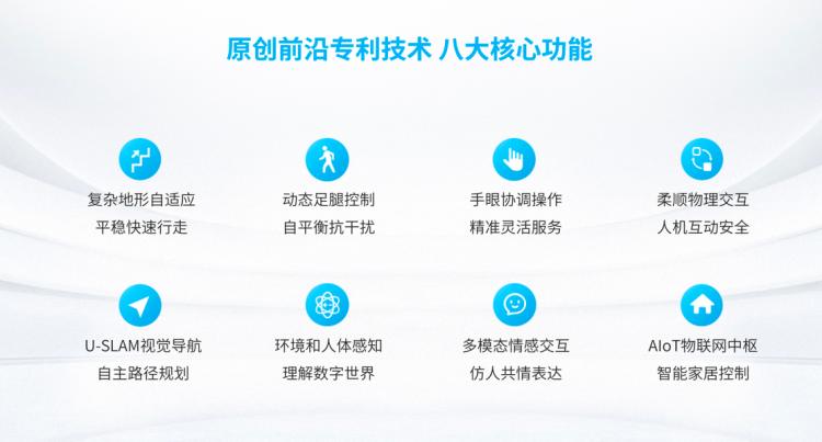 在智能化方面,Walker X实现了多项技术的升级:采用U-SLAM视觉导航技术,实现自主路径规划;基于深度学习的物体检测与识别算法、人脸识别算法和跨风格人脸数据生成技术,可以在复杂环境中识别人脸、手势、物体等信息,丰富准确的理解和感知外部环境;手眼协调等AI和机器人集成技术,可以提供更加精准灵活的服务,具备物体识别分拣与操作能力,可以自主操控冰箱、咖啡机、吸尘器等家电;末端柔顺控制技术,可以完成按摩、拧瓶盖、端茶倒水等家居任务;内置的原生28+机器人情绪体系,可以进行主动式交互,与用户建立共情。