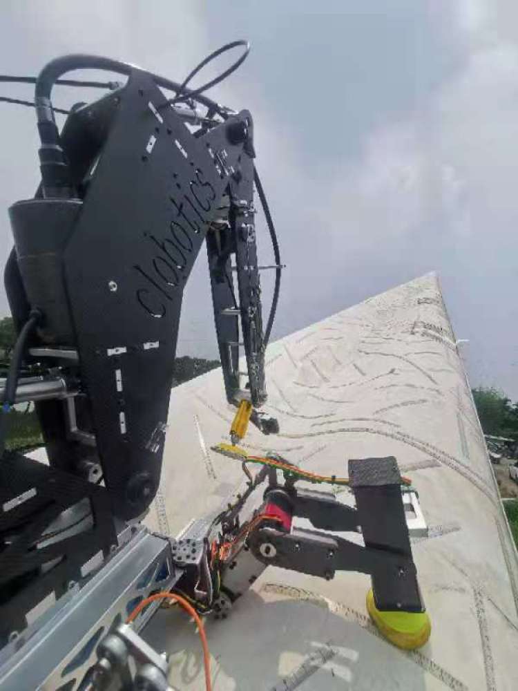 此次人工智能大会期间,扩博智能发布了基于计算机视觉的机器人全自动检测检修平台,基于该平台的攀爬维修机器人已处于研发阶段,可实现在在役叶片上固定与多自由度行走功能。同时,根据扩博风电巡检方案提供的叶片缺陷,对目标缺陷(非玻璃纤维)进行维修,可实现打磨、喷涂等标准维修工艺。