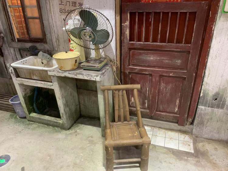 水泥水斗里放着“老花”脸盆,门前一把破破的“靠背椅子”旁,是一打开就会发出“嘎吱嘎吱”声音的老式“摇头扇”;