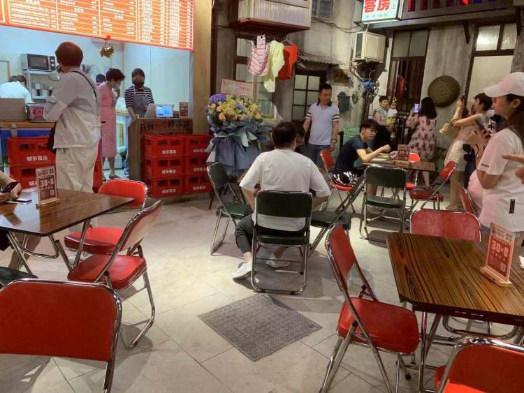 有意思的是,城市市集最重要的主题其实是美食,沉浸式的场景间串联起的是大壶春、鲜得来、沈大成、泰康食品、七宝老街汤圆等等餐厅、美食店,为了与周边的环境更匹配,餐饮店铺也将就餐桌椅替换为符合90年代背景的板凳、折叠椅,让食客们吃一顿“怀旧餐”。