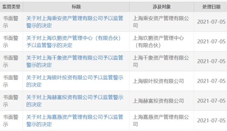 根据检查结果,7月5日上交所对上海嘉恳资产管理有限公司、上海赫富投资有限公司、上海银叶投资有限公司、上海千象资产管理有限公司、上海玖鹏资产管理中心(有限合伙)、上海乘安资产管理有限公司作出监管警示。