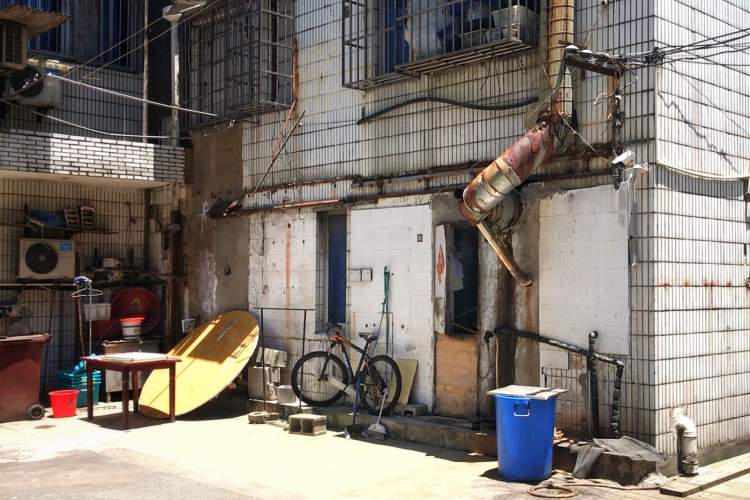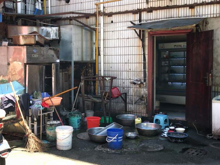 在三家餐馆后面,露天堆放着一些餐厨垃圾和其他生活垃圾。有一家餐馆在后厨门外自搭的棚子里杀鸡,现场鲜血淋漓,苍蝇横飞。站在楼上人家的窗口,这一切都历历在目。