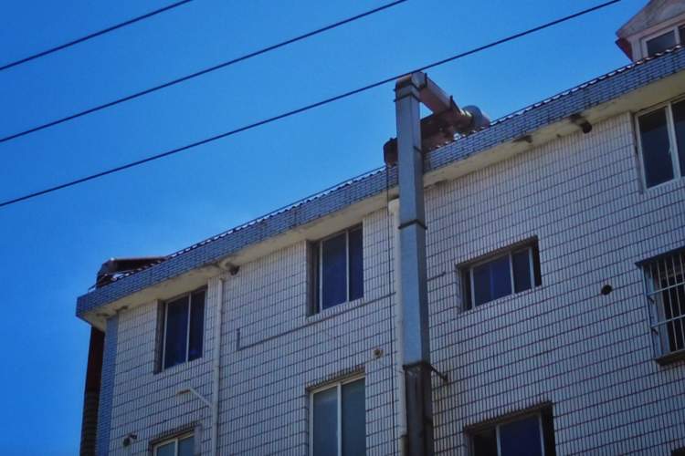 记者看到,川菜馆新得发亮的排烟道贴着二楼人家的阳台向上,回弯到餐馆的平屋顶上,与另外两家的烟道会合在一起。