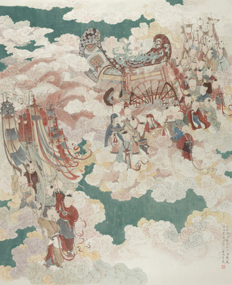 在历时8个月创作完成的《东皇太一》中,徐旭峰创造出一个仙人的理想居所,在这个虚空的世界里,众神各司其职,其乐融融,上演着凡俗人间的种种祭祀之礼、歌舞之乐。徐旭峰表示,这不仅是对于太一神的一次解读,更反映出中国人侑神却不迷信的积极态度。
