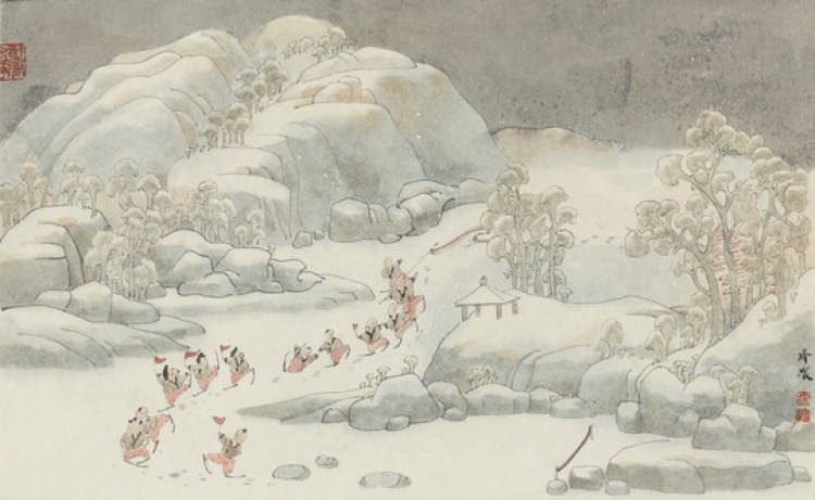 此次展览中的“沈周印象”系列也是徐旭峰爱玩的表现。他以刘海粟美术馆所藏沈周册页为题,打破原作条理,只保留山水构图,线条参考了顾恺之的《洛神赋》,场景运用了戏剧性融入,让一群小儿在沈周的山水中进行冰面运动,在悬崖边庆生,在树丛中挑灯夜行。