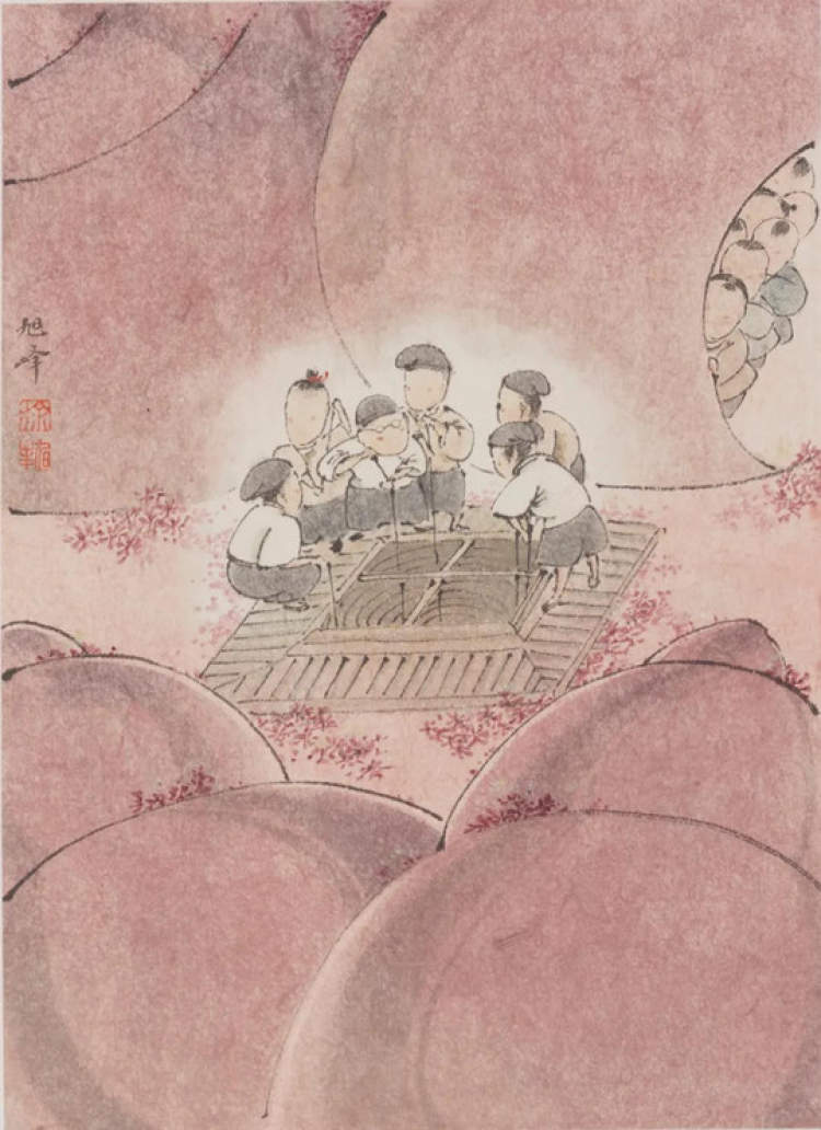 在“别有洞天”系列作品中,徐旭峰描绘了“仙界”与“隐居”两种理想叠合的意象,其中的审美意境既远又近,仙界气息与平凡农村相谐共存。那些小人在桃花源中悠游自在,不禁让人有出尘之想。
