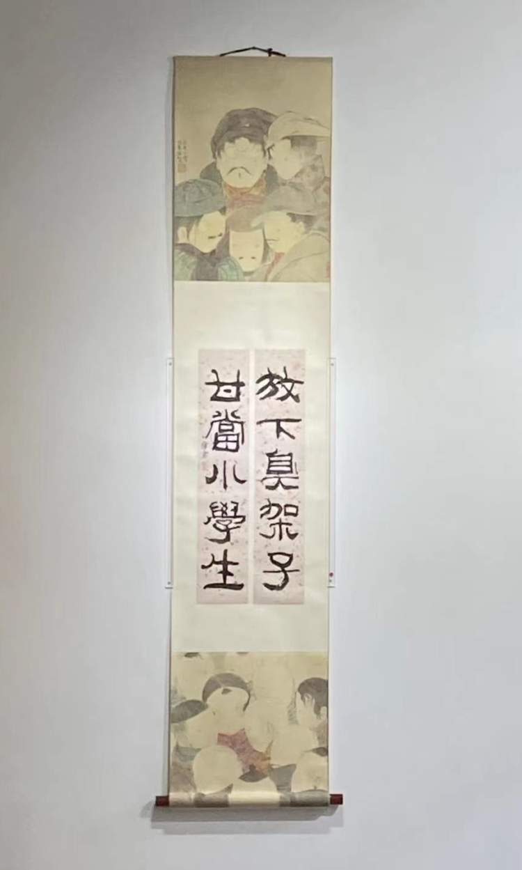 展览中还有件“奇品”值得打量,一件书法立轴“放下臭架子,甘当小学生”,字是程十发先生写的,徐旭峰却在立轴的天头和地头部分,绘上了他那些面目模糊的小人,聚在一起,似乎在议论程十发先生写的这句话,又或许,画中人的游离神态正是徐旭峰自己的内心观照,但无论如何,这是件好玩又奇特的展品。