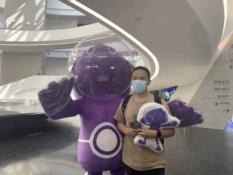 18日一早,天文馆的工作人员就早早开到馆里,准备迎接观众,对于第一位观众,吉祥物科飞热情地送上了拥抱,送上了精心准备的大礼包。