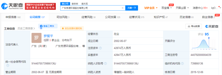 天眼查数据显示,芳源股份成立于2002年6月,公司注册资本42874万元人民币,法人代表罗爱平;芳源股份从事含镍、钴废物循环回收及镍电池、锂电池正极材料研发、生产及销售;芳源股份预告2021年半年报业绩,净利润4000万至4500万元,同比增长幅度为8.67倍至9.88倍。