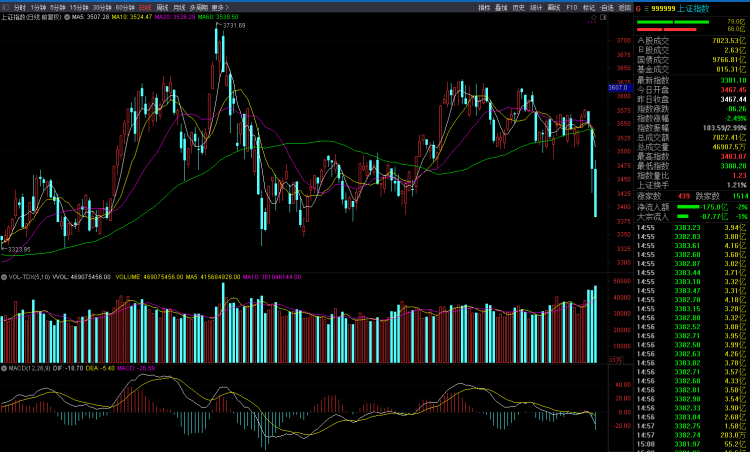 今天,沪深两市双双高开,盘中5G概念拉升,明阳电路、沪电股份等近10股涨停,中际旭创、中京电子等跟涨;汽车整车板块活跃,东风汽车(600006)、北汽蓝谷(600733)、金龙汽车(600686)、宇通客车(600066)等纷纷反弹。午后富时中国A50指数期货日内跌幅达2%,此前一度涨超1.5%。这直接带动大A再度掉头回落。最后沪市下挫86点,报收3381点,跌幅2.49%,创业板下挫4.11%。两市超3300家个股下跌,成交额破1.5万亿元,亏钱效应弥漫。