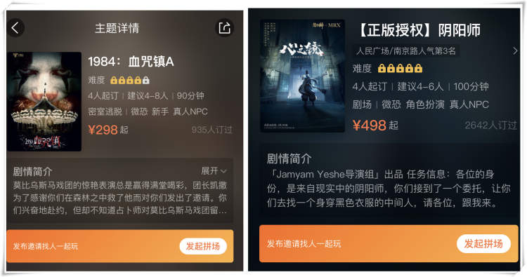 这些有胆量开进商场的实景店,确实也不负使命。从大众点评网上可以看到,“TIME沉浸式娱乐密室剧场”悦荟店的“1984:血咒镇A”主题,一局90分钟,328元/人;“MR.X-X先生阴阳师”新世界店,一局100分钟,客单价根据时段分为498元、598元两档。从预订情况来看,无论工作日还是双休日,都基本客满,双休日甚至要提前两周才可能订到。